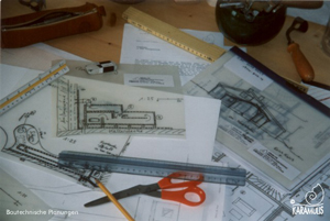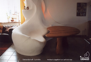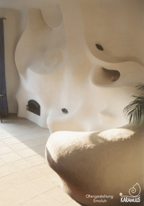Der Speicherofen "Émoluh" sollte eine geringstmögliche Tiefe aufweisen, Feuerraum und Heizzüge wurden so flach wie möglich gebaut, nur die temperierte Sitzfläche ragt weiter in den kleinen Wohnraum hinein. Trotzdem reicht - aufgrund einer speziellen Konstruktion der Abstrahlflächen innerhalb der äußeren Ofenhülle - die im geschlossenen Kreislauf zirkulierende Hitze aus, die Sitzbank „Lumálla“ (siehe auch „Sitzlandschaften“) im Obergeschoss und auf dem Rückweg noch ein Wandrelief in der Küche zu temperieren. Die richtige Dimensionierung von Dämm-Material und Zug-Querschnitten war entscheidend für die Ergiebigkeit dieses Hypokaustensystems.