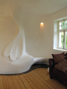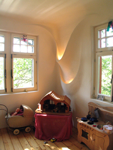 KARAMULIS ersetzte die Wand zwischen Diele und Wohnzimmer im Erdgeschoss durch einen gestalteten Speicherofen. Notwendige Unterzüge im Deckenbereich verschwanden im schwach gewöbten Deckenrelief. Intuitiv gestaltete Licht-Quellen auf der "Ofenwand" mit "Sitzmuschel" nehmen Bezug zu einem gegenüberliegenden Lichtobjekt zwischen den teilweise neuen Fenstern. Das Kinderzimmer im 1.OG war bis dahin ein wenig genutzter eher dunkler Raum. Das neue Lichtrelief gibt seiner Seele sozusagen "Flügel". Es trägt symbolisch ein Lichtwesen mit sich, das den Betrachter auch an die Gestalt eines gewickelten Babys erinnern kann. Im gleichen Geschoß wurde auch die Dusche gestaltet - mit einer sanft umfassenden, schützenden Geste.